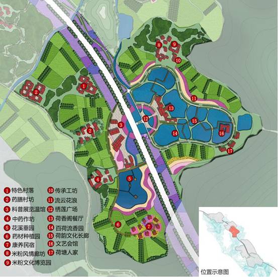 荷,出淤泥而不染,濯清涟而不妖;荷,既具有良好的生产经济效益和景观效益,又具备深厚的文化底蕴,因此策划本景区充分利用和保护荷、田、山等生态景观资源,融入荷花文化、米粉文化,彰显生态、文化、休闲特质,打造集荷塘观光、文化体验、休闲康养、会议度假为一体的生态文化旅游区。