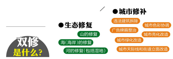 “城市双修”是指生态修复、城市修补。其中,生态修复,旨在有计划、有步骤地修复被破坏的山体、河流、植被,重点是通过一系列手段恢复城市生态系统的自我调节功能;城市修补,重点是不断改善城市公共服务质量,改进市政基础设施条件,发掘和保护城市历史文化和社会网络,使城市功能体系及其承载的空间场所得到全面系统的修复、弥补和完善。