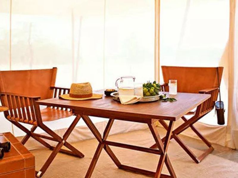 每一间帐篷都非常宽敞,百色的帷幔也使得整个空间无比亮堂。帐篷里没有一面实体墙,卧室、起居室、卫生间、浴室、更衣室等功能区均由纱幔所隔开。所有家具以及装饰物均有木、石、皮革等天然材料制成,透露出原始、野性的风格。虽说是帐篷,但房间设施丝毫不缺,从书桌、床、午睡榻到长椅、餐桌,一切豪华酒店房间里应有的设施这里都有。